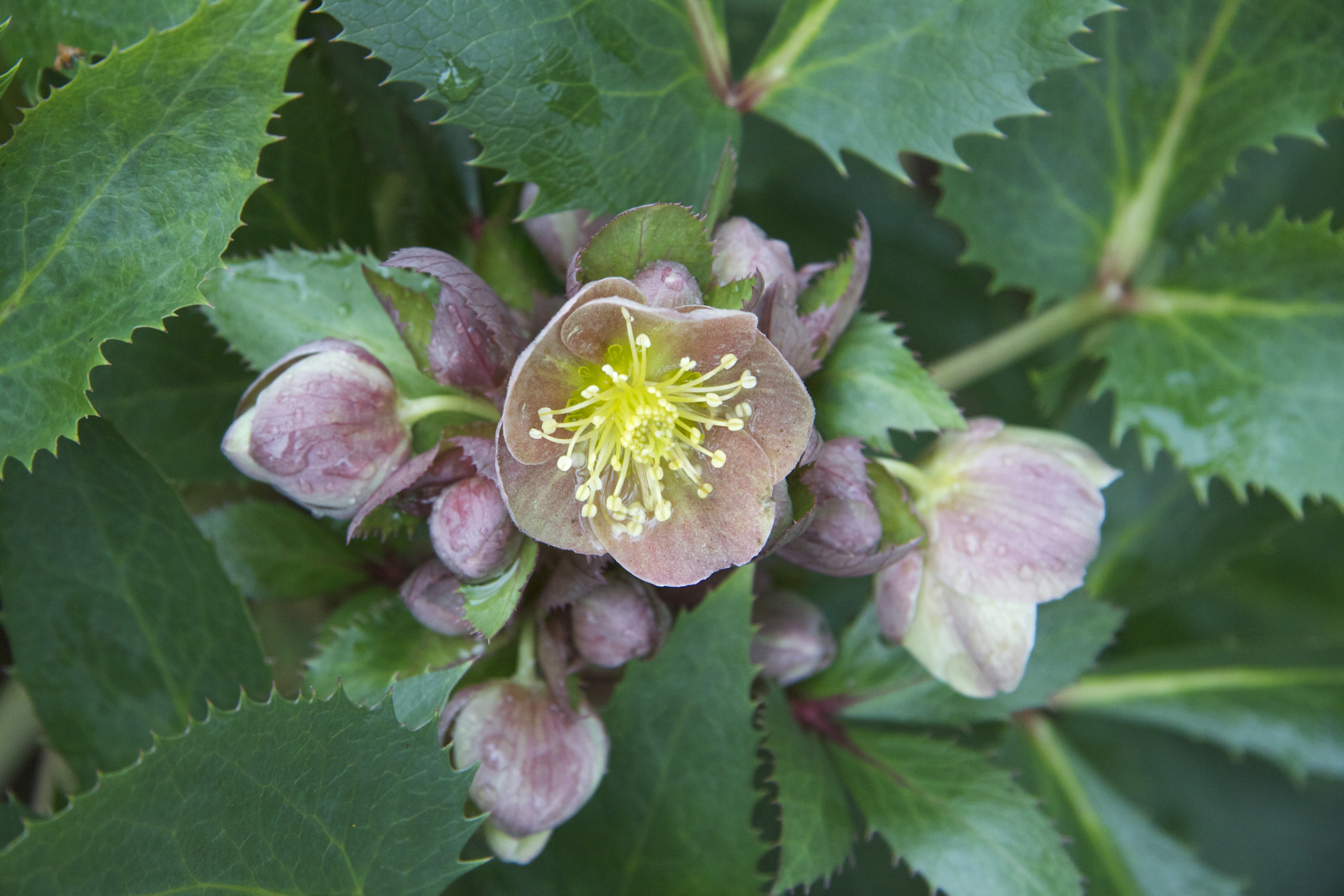 After admiring the fine princesses of the Hellebore world, it is a pleasure to see the distinctly muscly, Helleborus x sternii with soft pink-grey flowers take on the role of a small architecutural shrub: