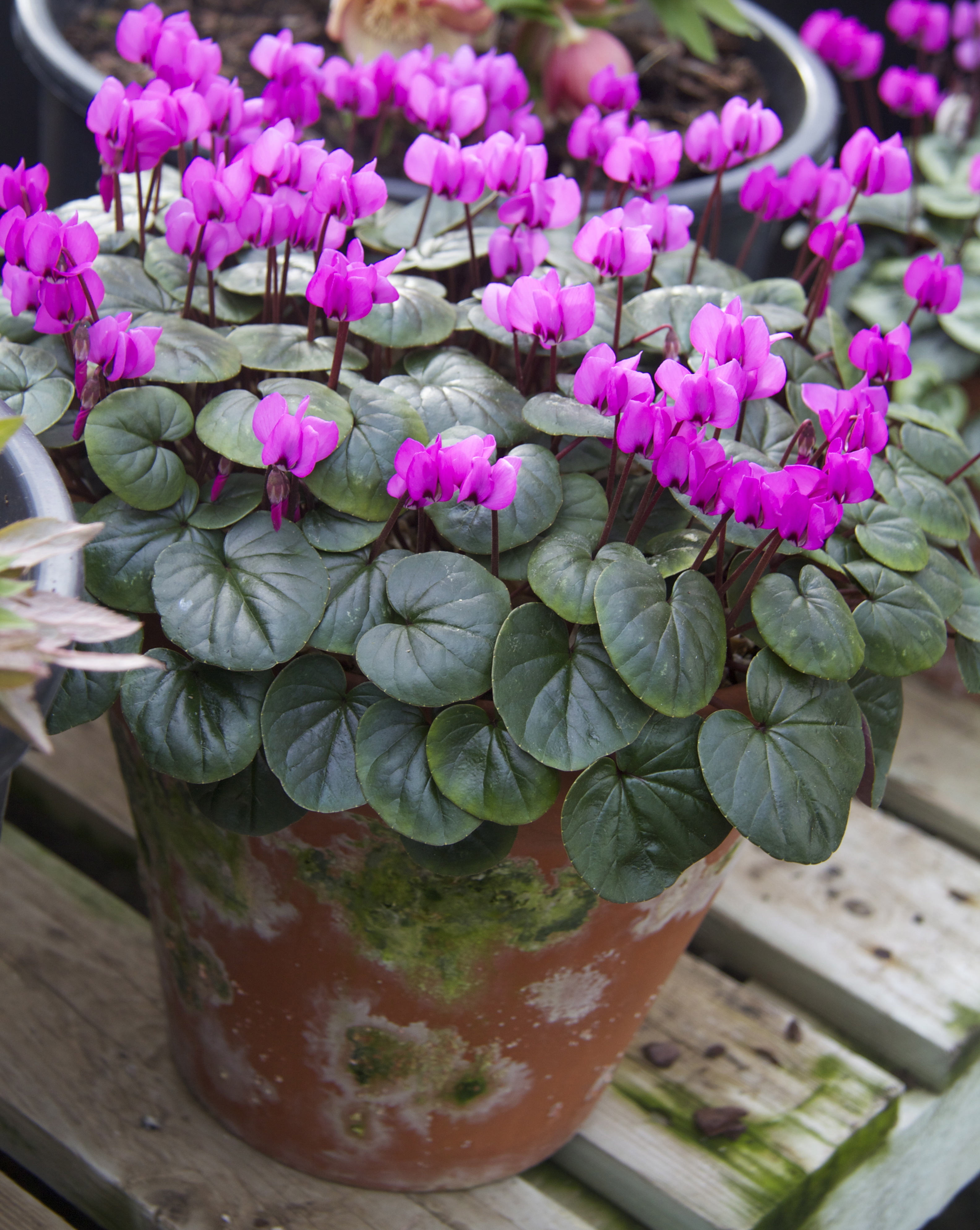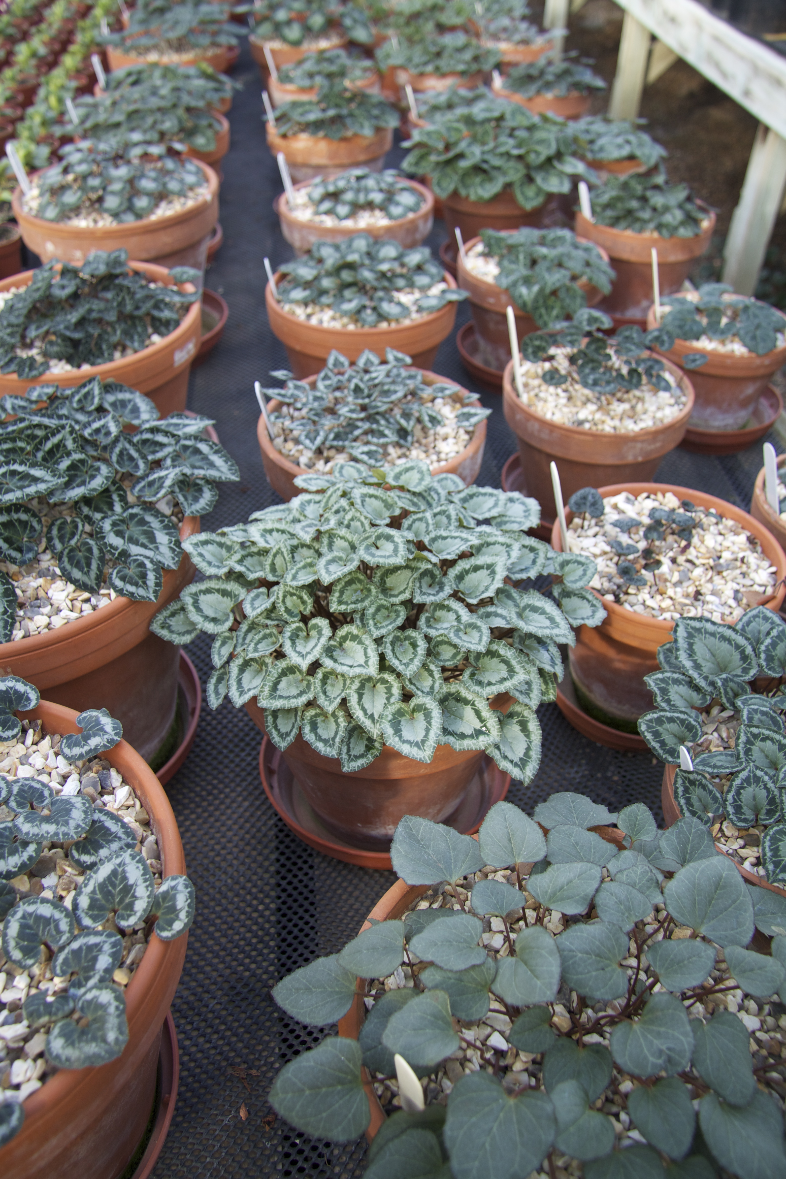Dizzy with hellebores, we move onto Cyclamen. Phillip shows us fantastic fat pots of Cyclamen coum.