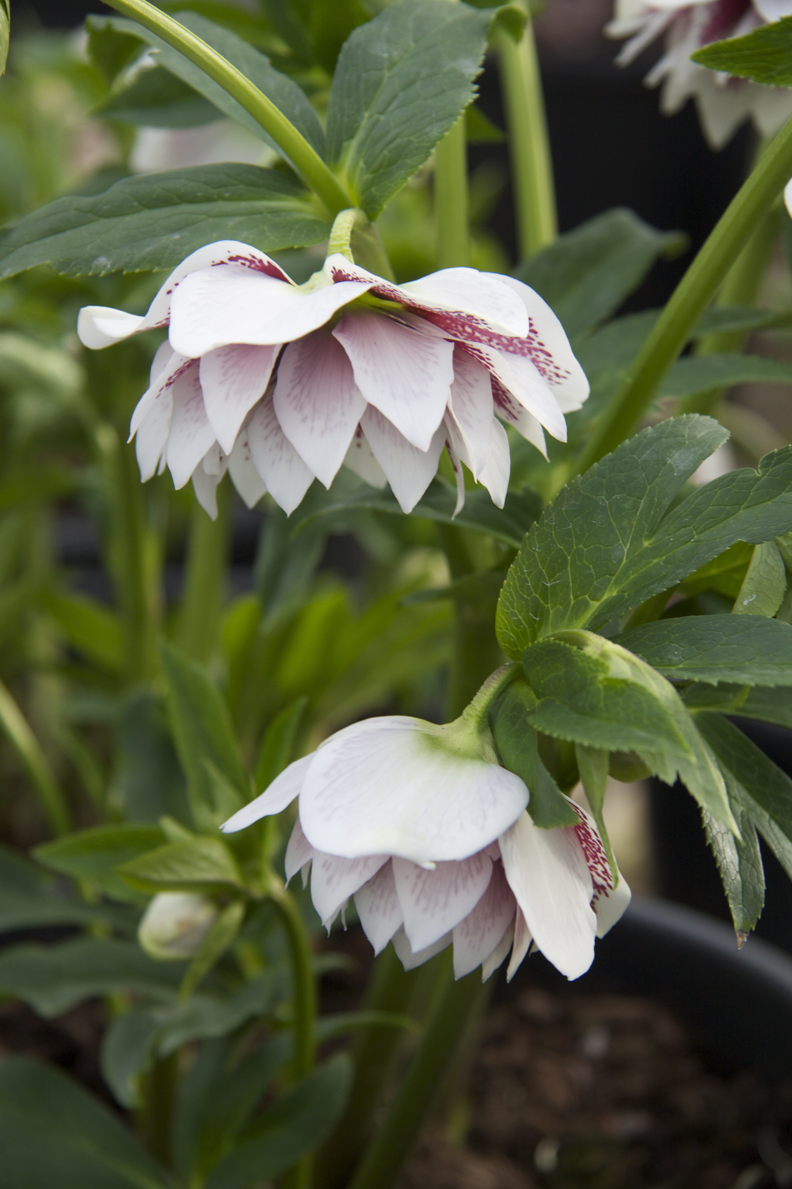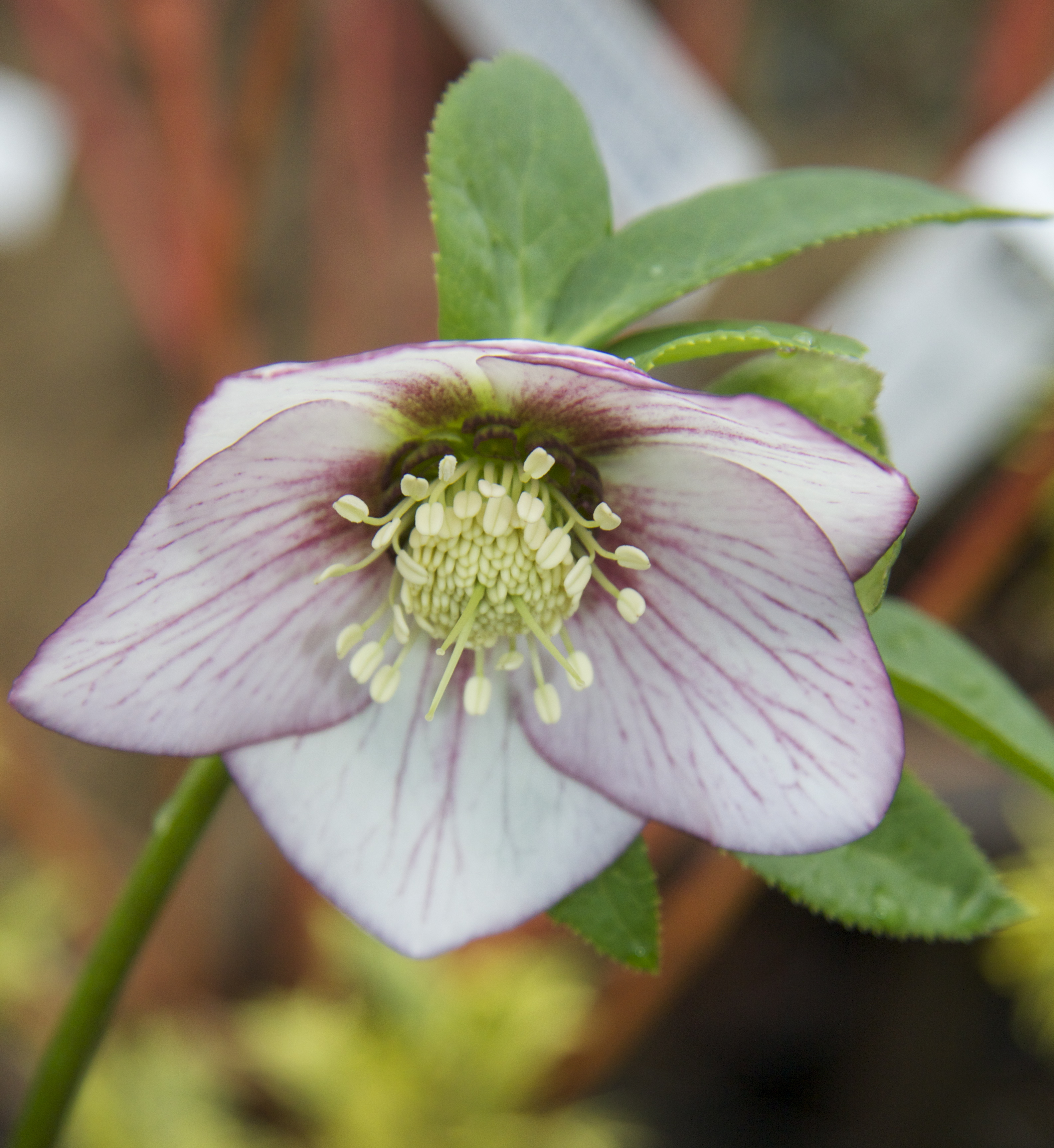 Back at Ashwood Nurseries, we stop to admire the finely etched lines of deep pink on white of this lovely Hellebore:
