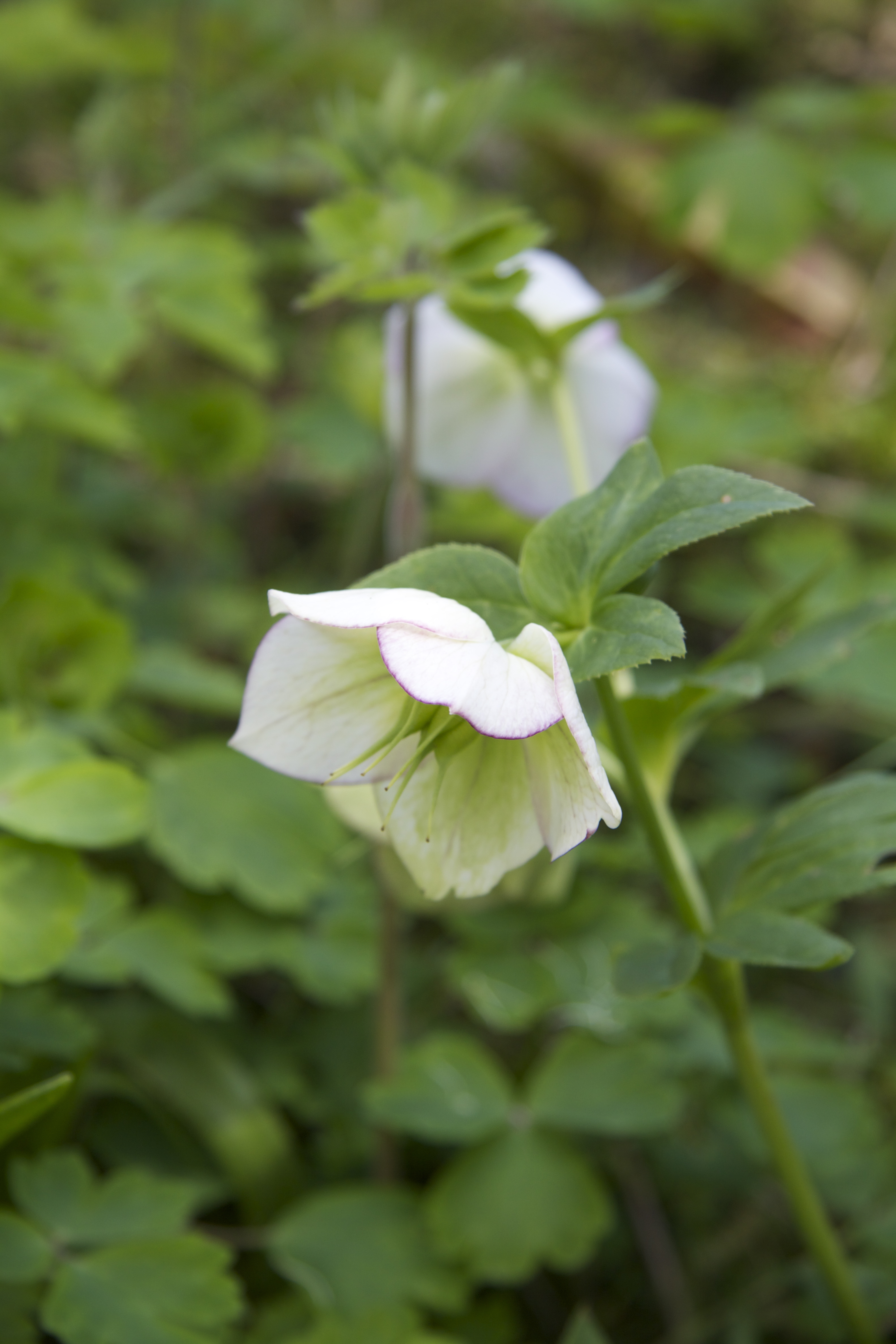 In the woodland garden we walk amongst competition quality examples of shade loving planting. There are still some perfect examples of the beautiful pink edged Helleborus orientalis ‘Harrington Double White Speckled’: