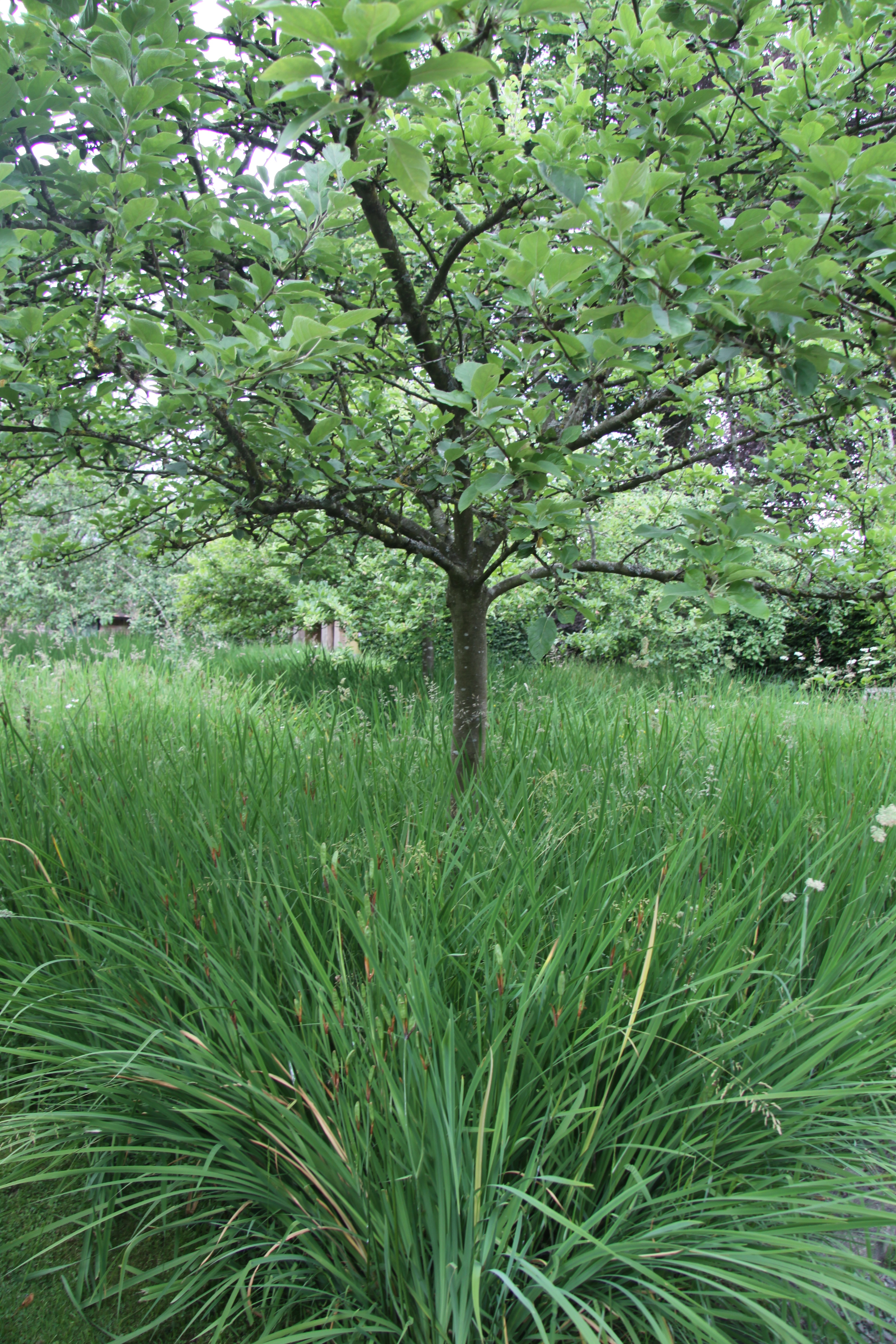 But it does not take long to warm us up. Looking more closely, the planting around the apple trees is now laced with pale pink field geraniums and softly fluttering tall grasses are now taking over as quieter, paler stars amongst the stiffer stems of the flowered iris.