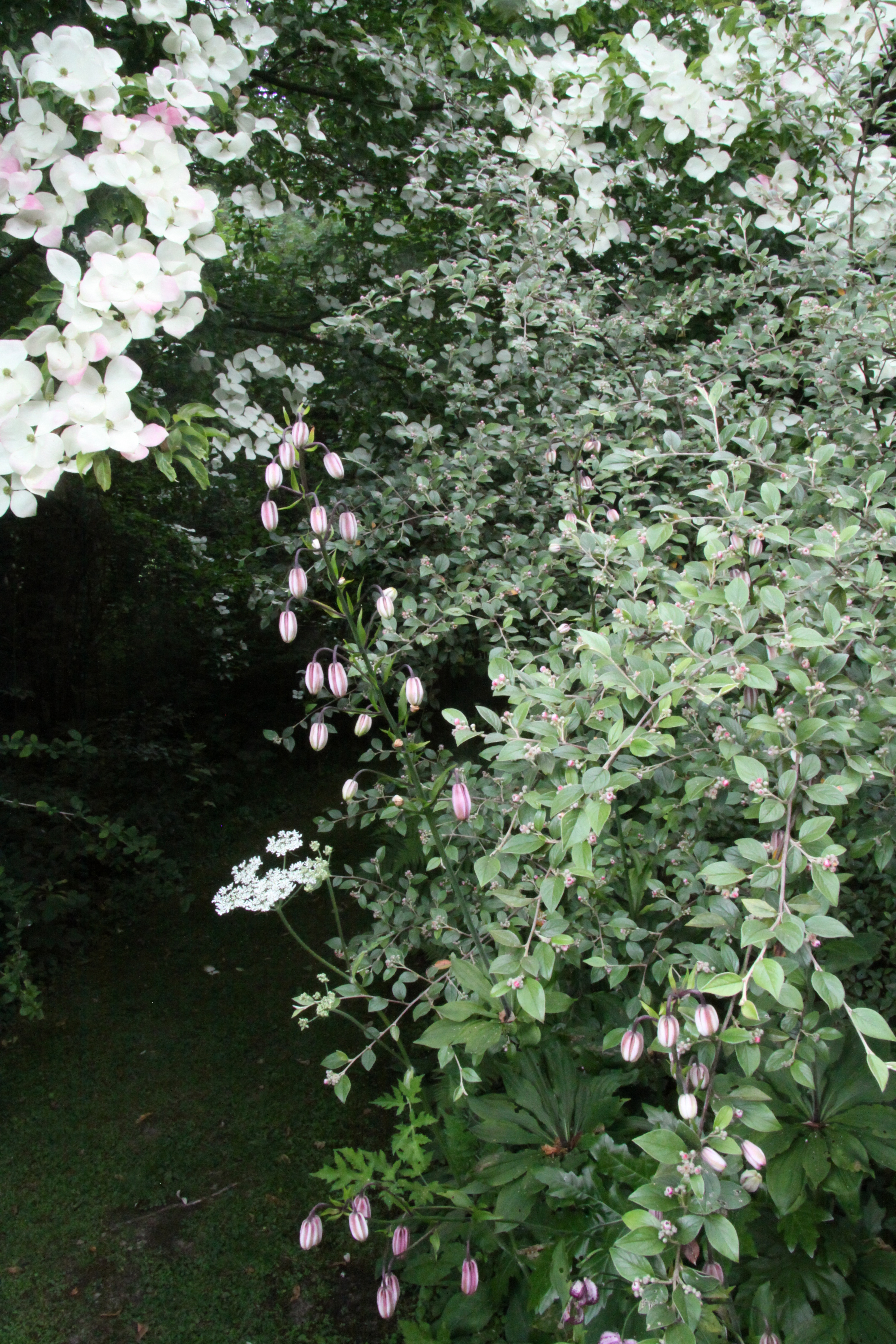 The transition from garden to woodland is marked by a lovely tree-fringed area dominated by a stunningly beautiful Cornus tree – I think it is ‘Norman Hadden – with pink tinged white bracts. The Cornus is underplanted with swathes of palest pink astrantia and dashes of richer pink Martagon lily:
