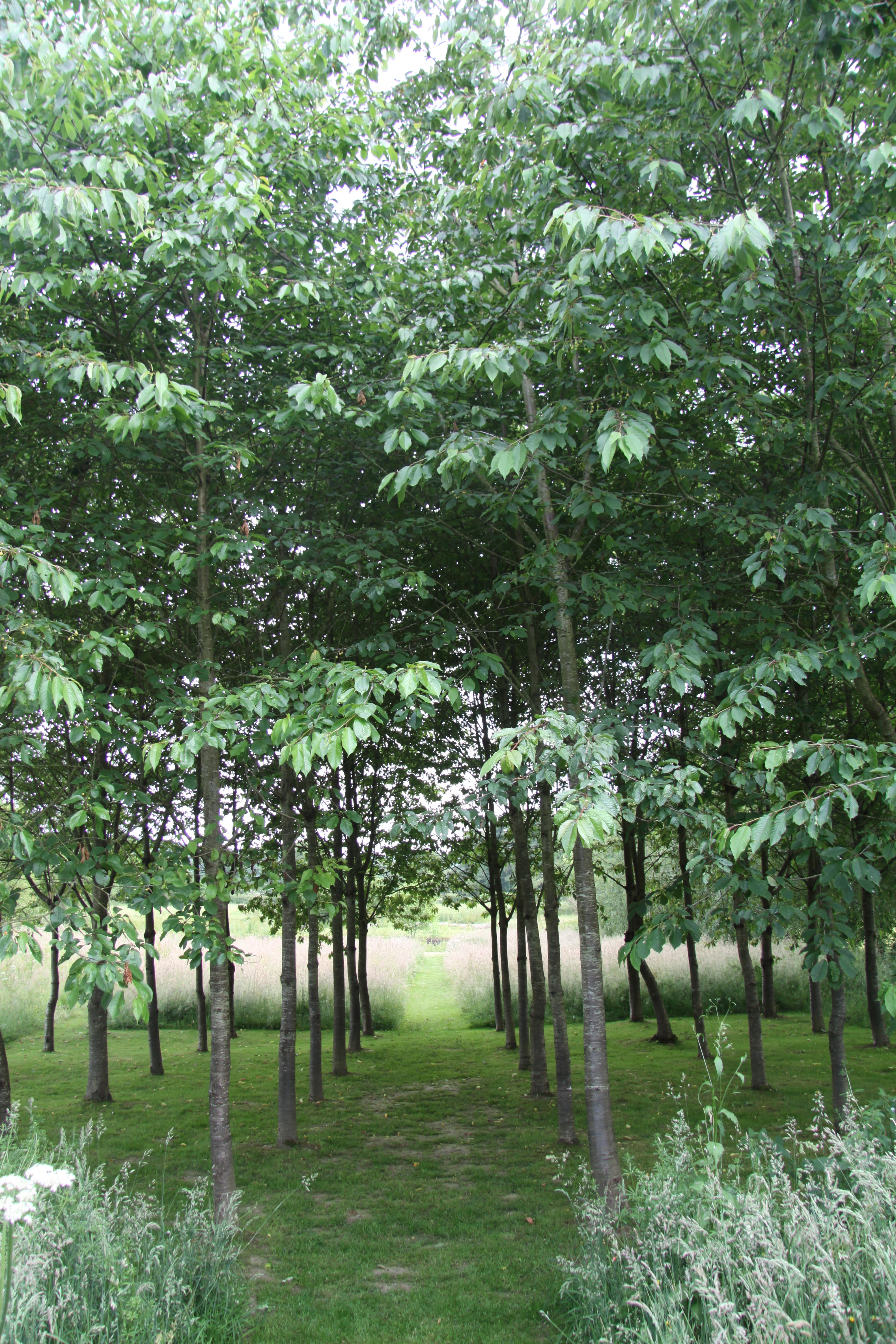 Much grown since the last time we visited is The Mezquita – a grid of bird cherry trees (Prunus avium) inspired by the onyx and marble columns of the the Mezquita in Cordoba. This had looked rather stiff and organised when we visited a few years ago but it is now a wonderful sturdy forest of slim-trunked trees which frame the view in every direction and offers a delightful place to sit: