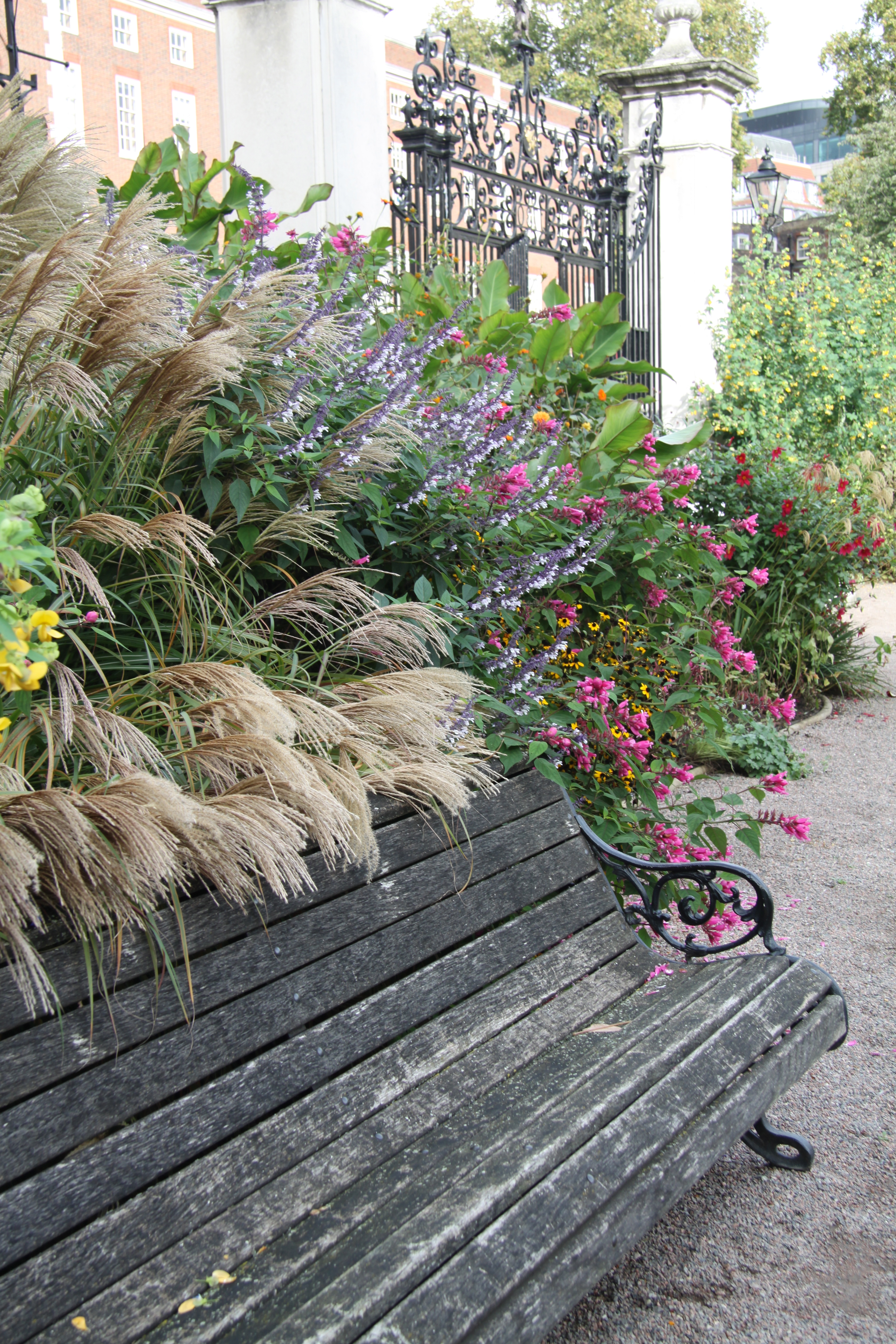 The garden was renovated by Colvin and Moggridge in 1994 and the style of planting is as soft and natural as the outer world of the Park is restrained and formal.  Even at the end of October vibrant mounds of Erysimum ‘Bowles Mauve’ spill over onto the sunken lawns.