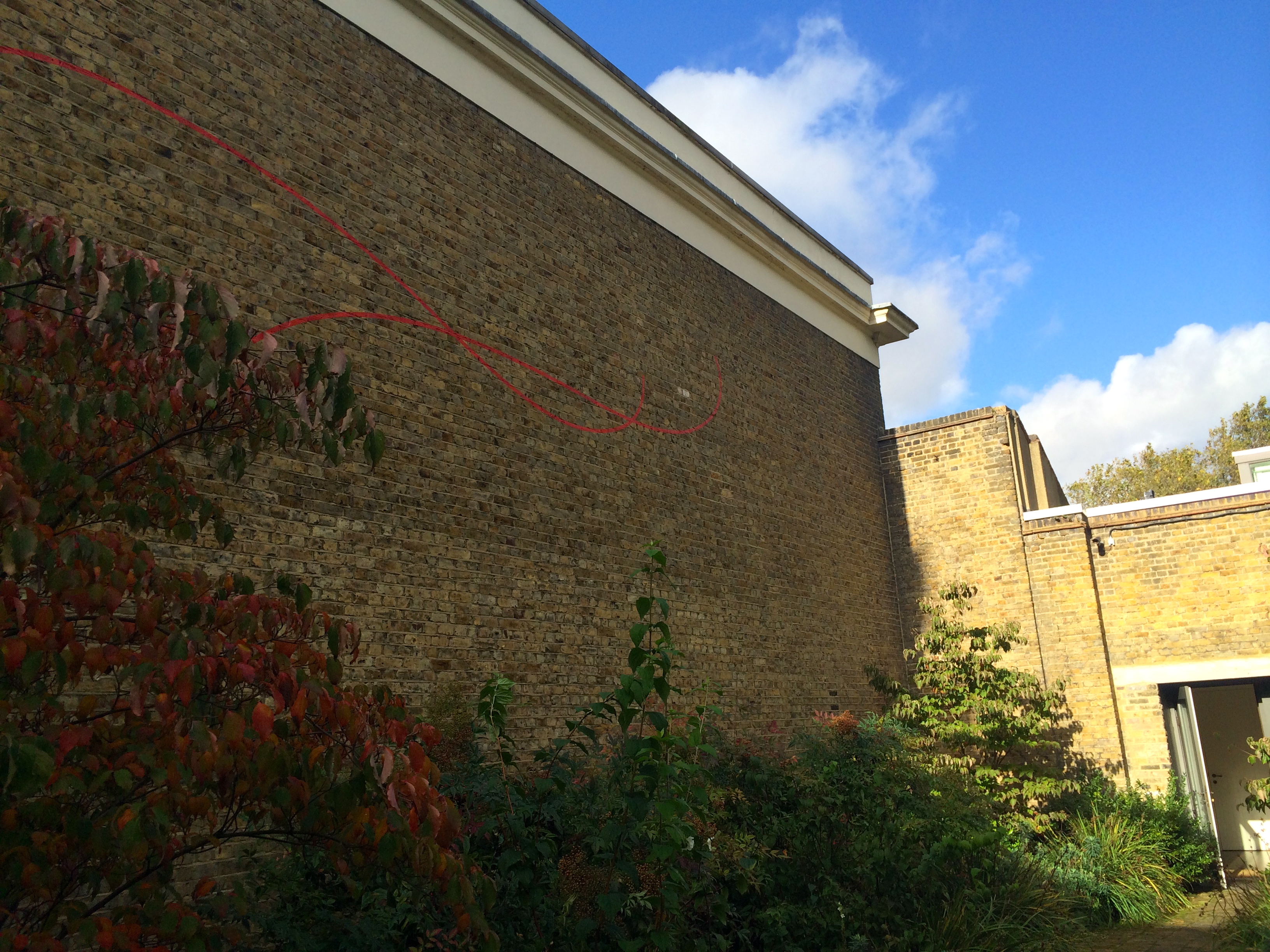 The garden surprises with scent too at different times of year – mounds of Sarcococca confusa flank the path at each end of the garden and the scent of Philadelphus fills the space in June.  And of course sometimes an artist will want to use the garden as part of the Gallery space itself. Until 23 November 2014 you can eat your lunch contemplating the elegant, swooping ‘wall sculpture’ by Lawrence Weiner – part of his ALL IN DUE COURSE exhibition in the main gallery: