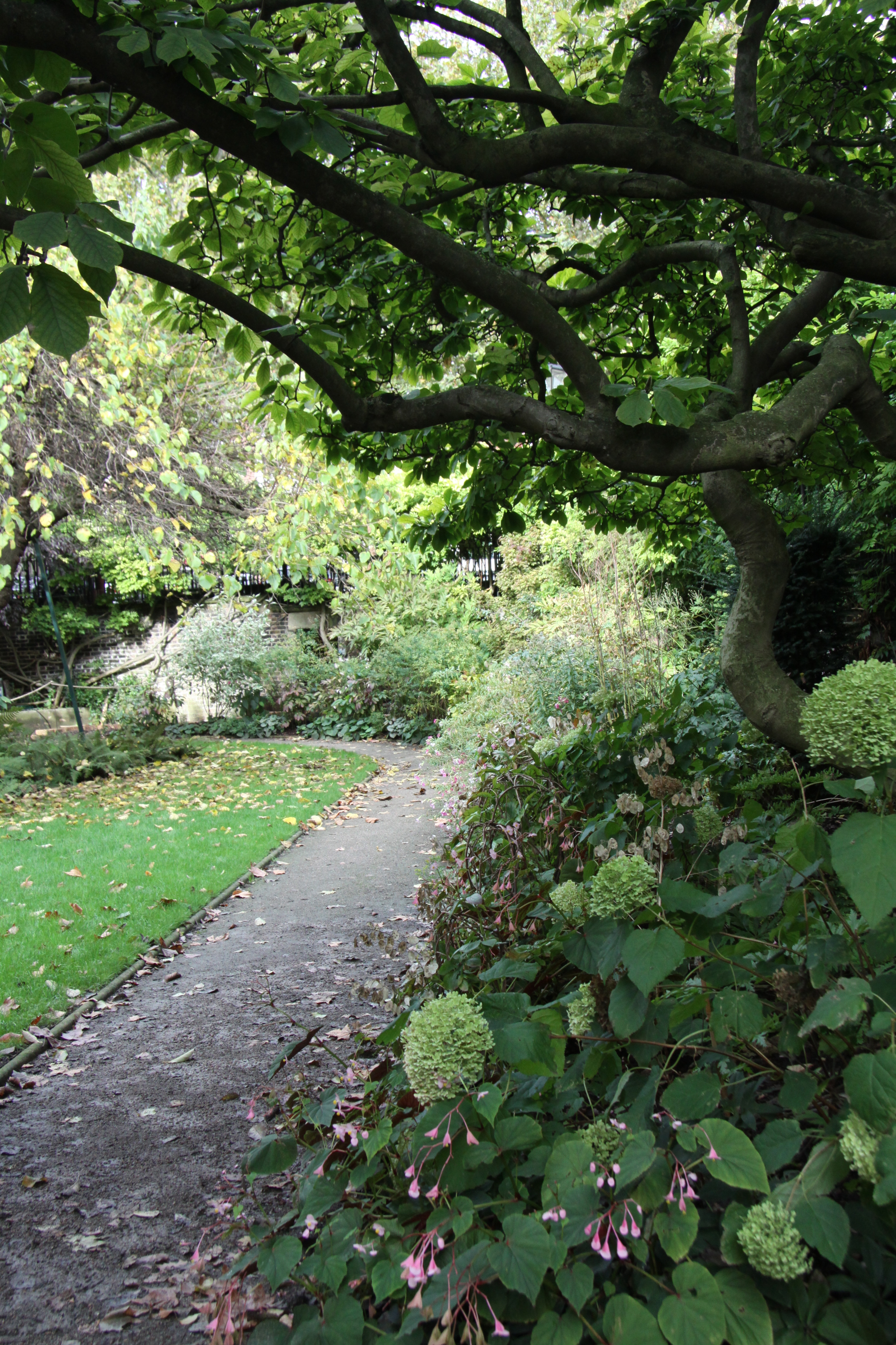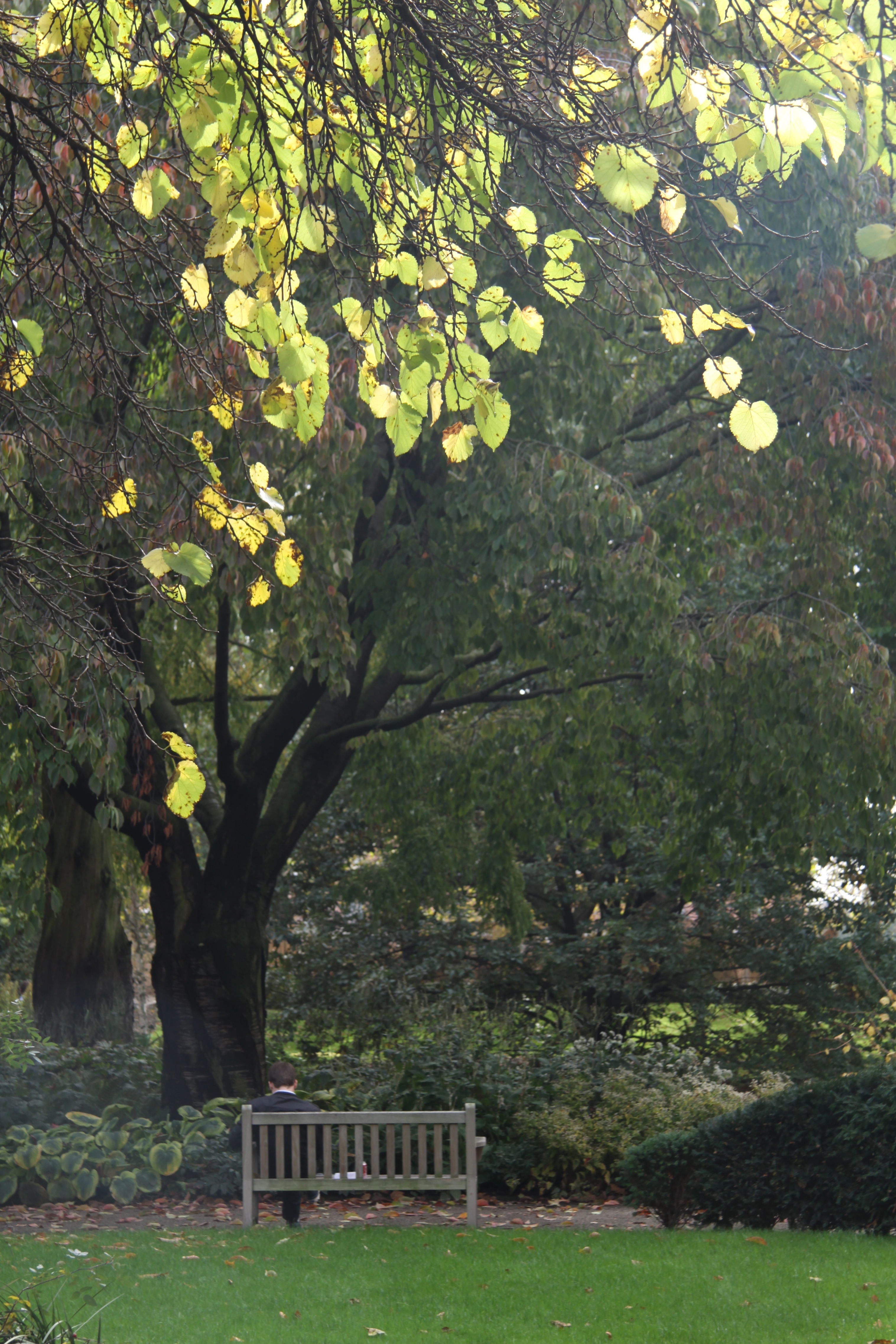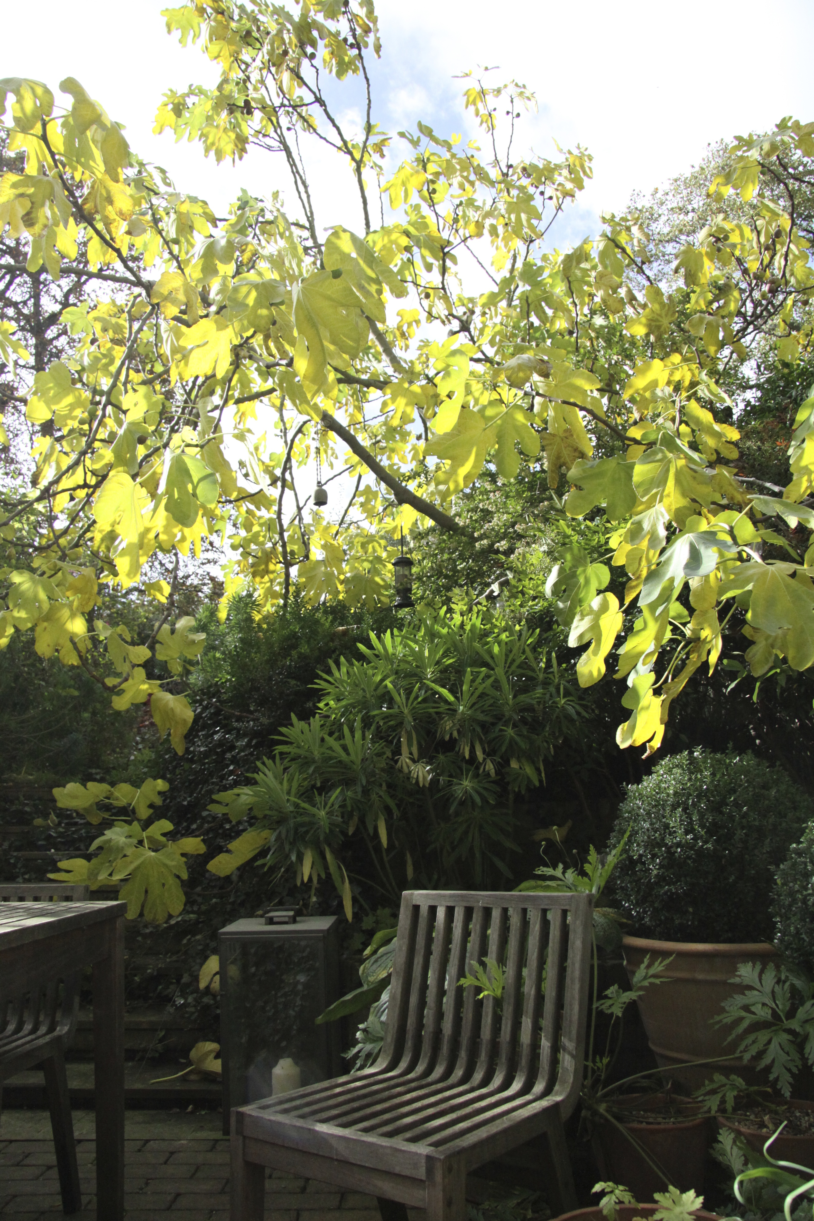 yellowed fig leafI realise I will be back here again tomorrow. Just round the corner is the Temple Church where one of my sons is singing.  I love these connections between art and gardens and film and trees and gardens and music.  Come to the concert tomorrow and try to visit the Inner Temple Garden whenever you can.