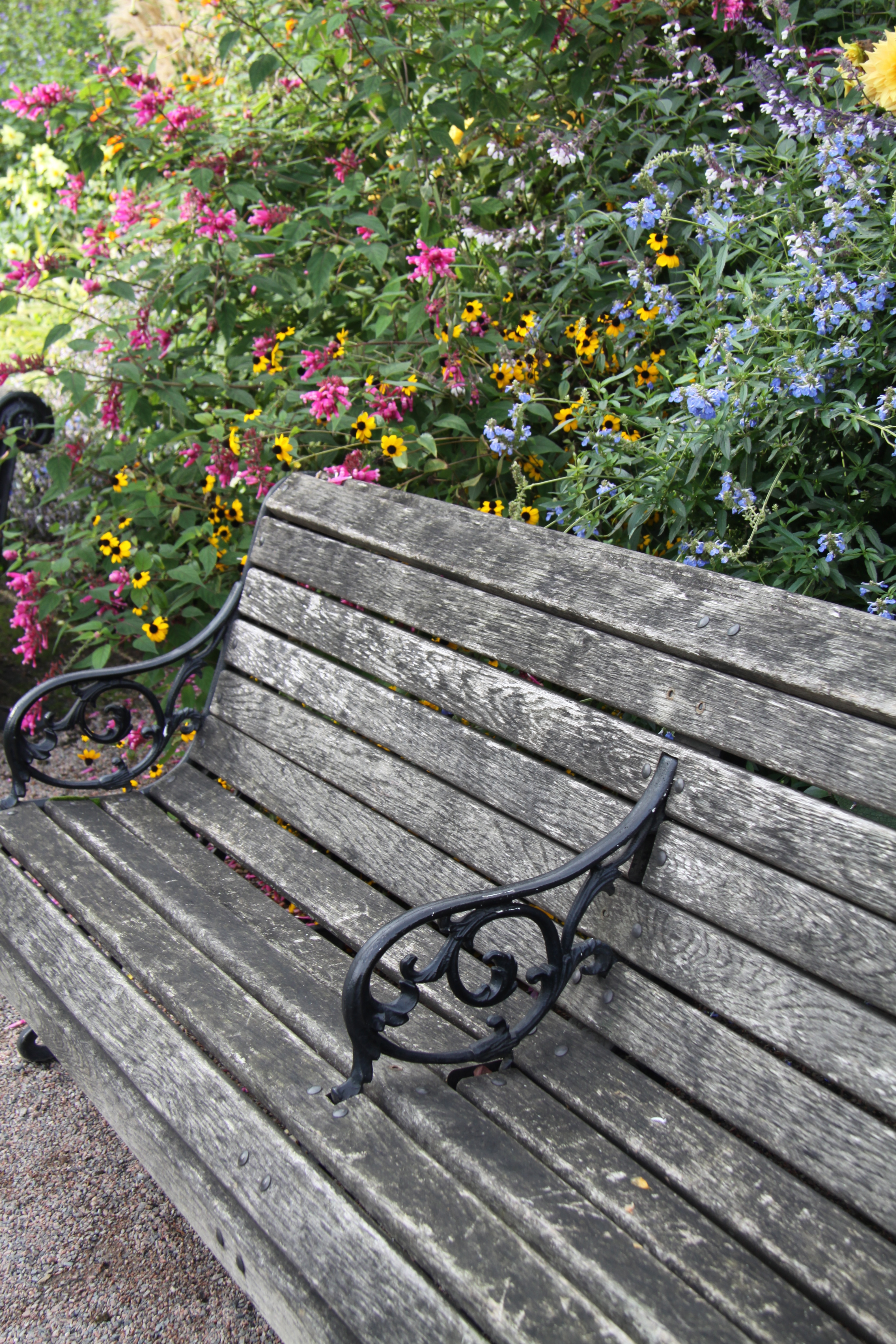 bench at st johnsA high backed wooden bench surrounded by geraniums, Viburnum davidii, and ferns