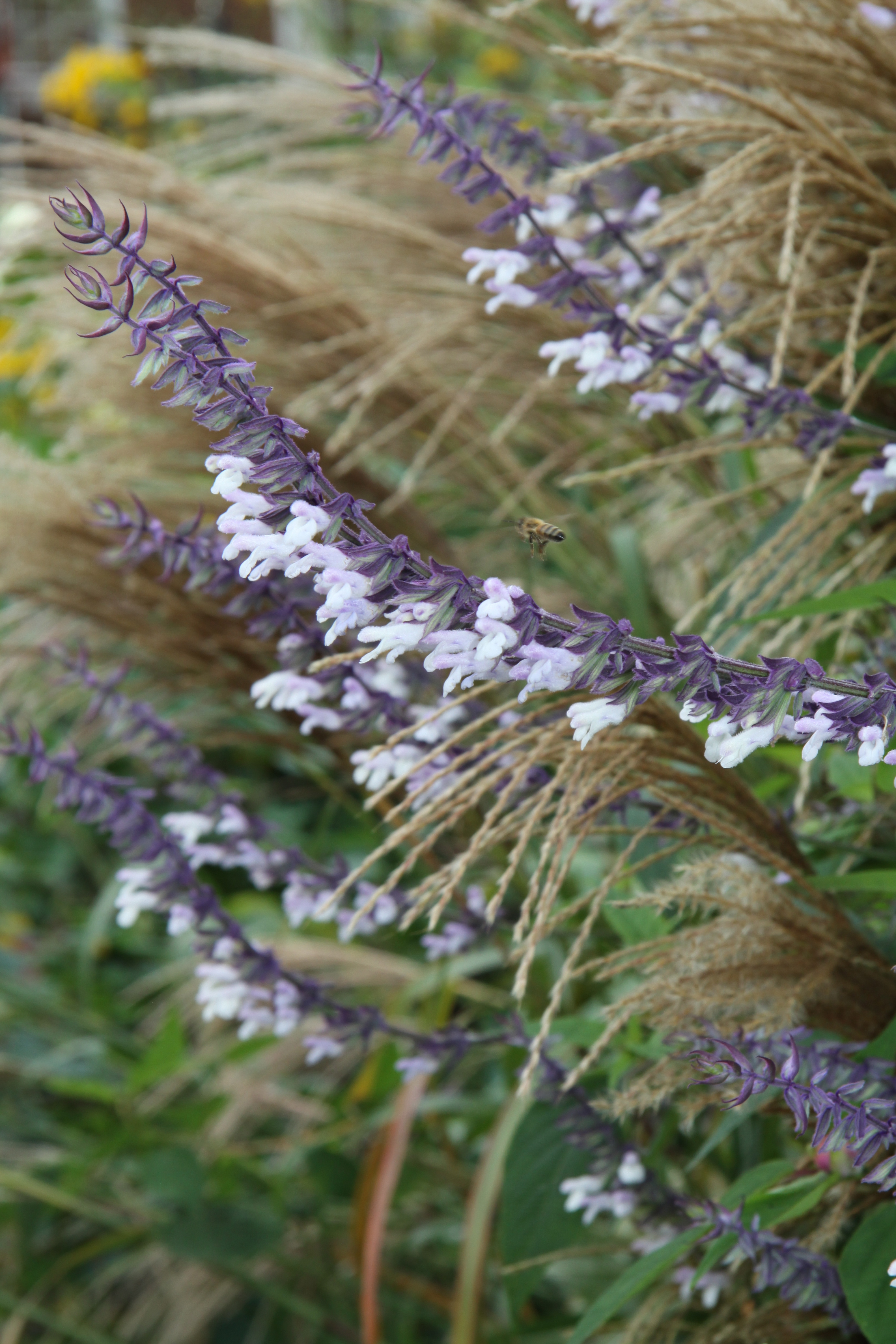 Iinner temple bench with miscanthusBench with Miscanthus sinesnsis, Salvia leucantha and Salvia involucrata ‘Bethellii’ spilling over