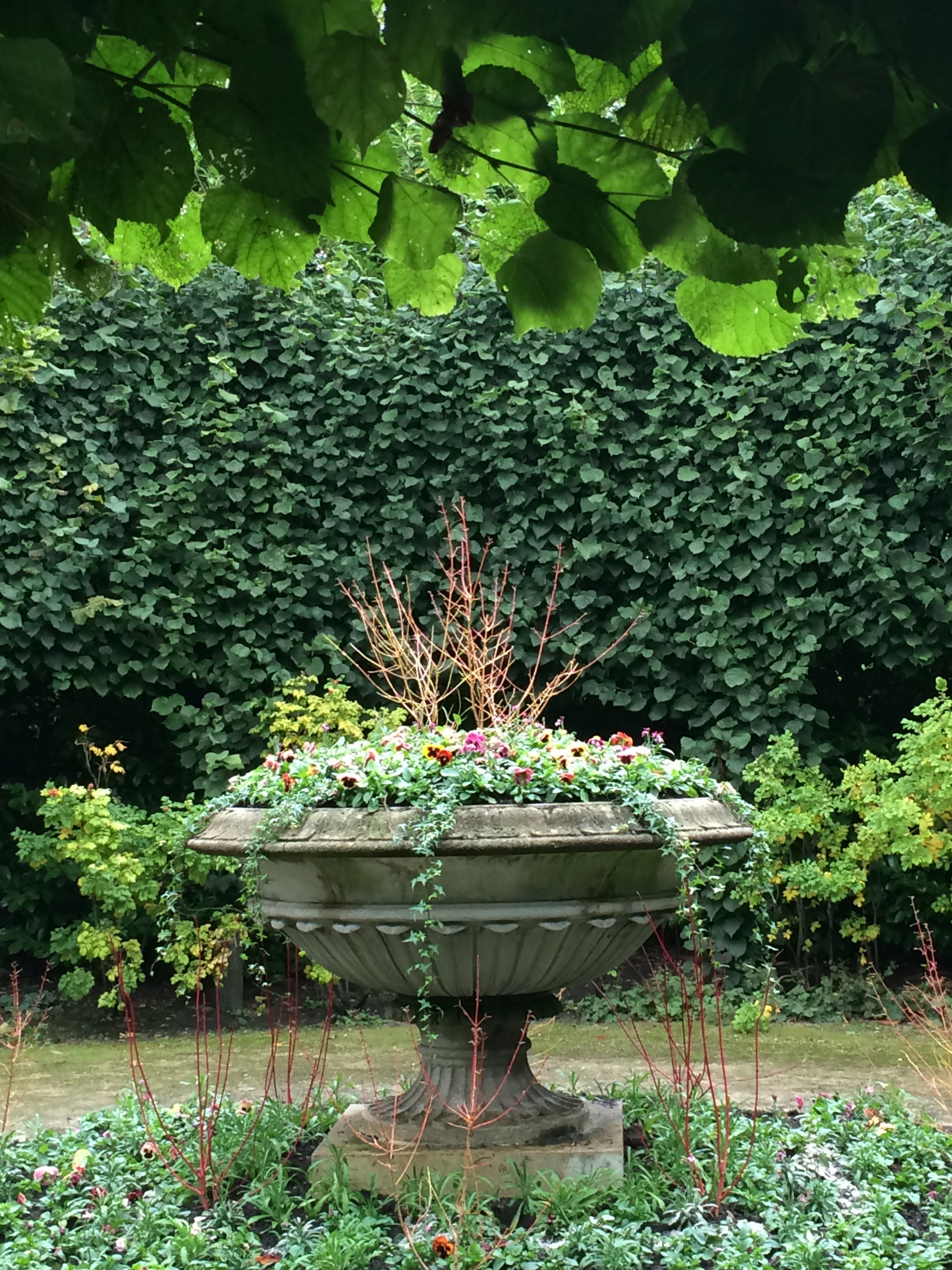 Vibrantly planted urn at the centre of the Garden of St John’s Lodge