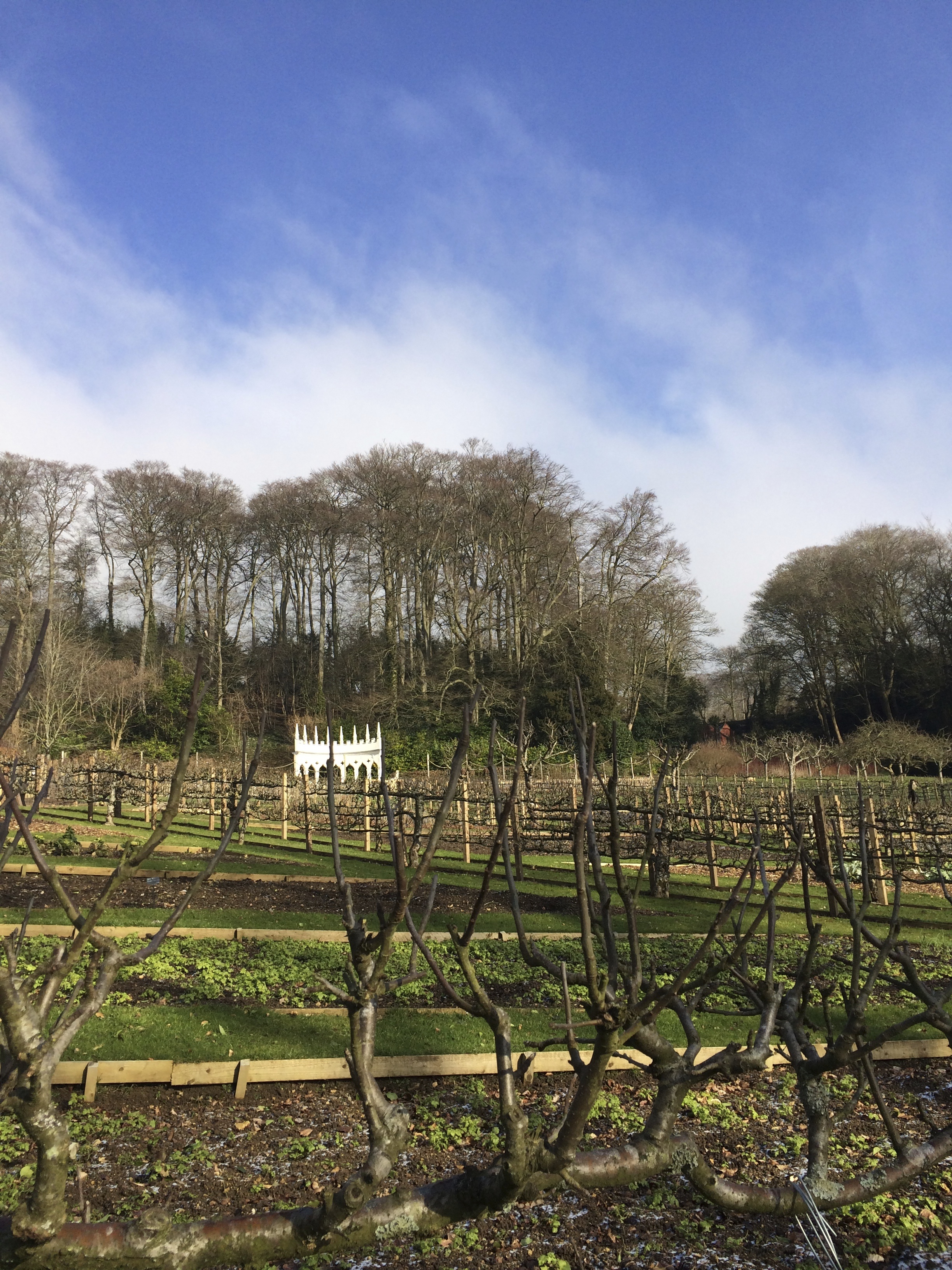 The Exedra – faithfully restored with timber and lime plaster – beyond immaculately pruned espaliered apple trees