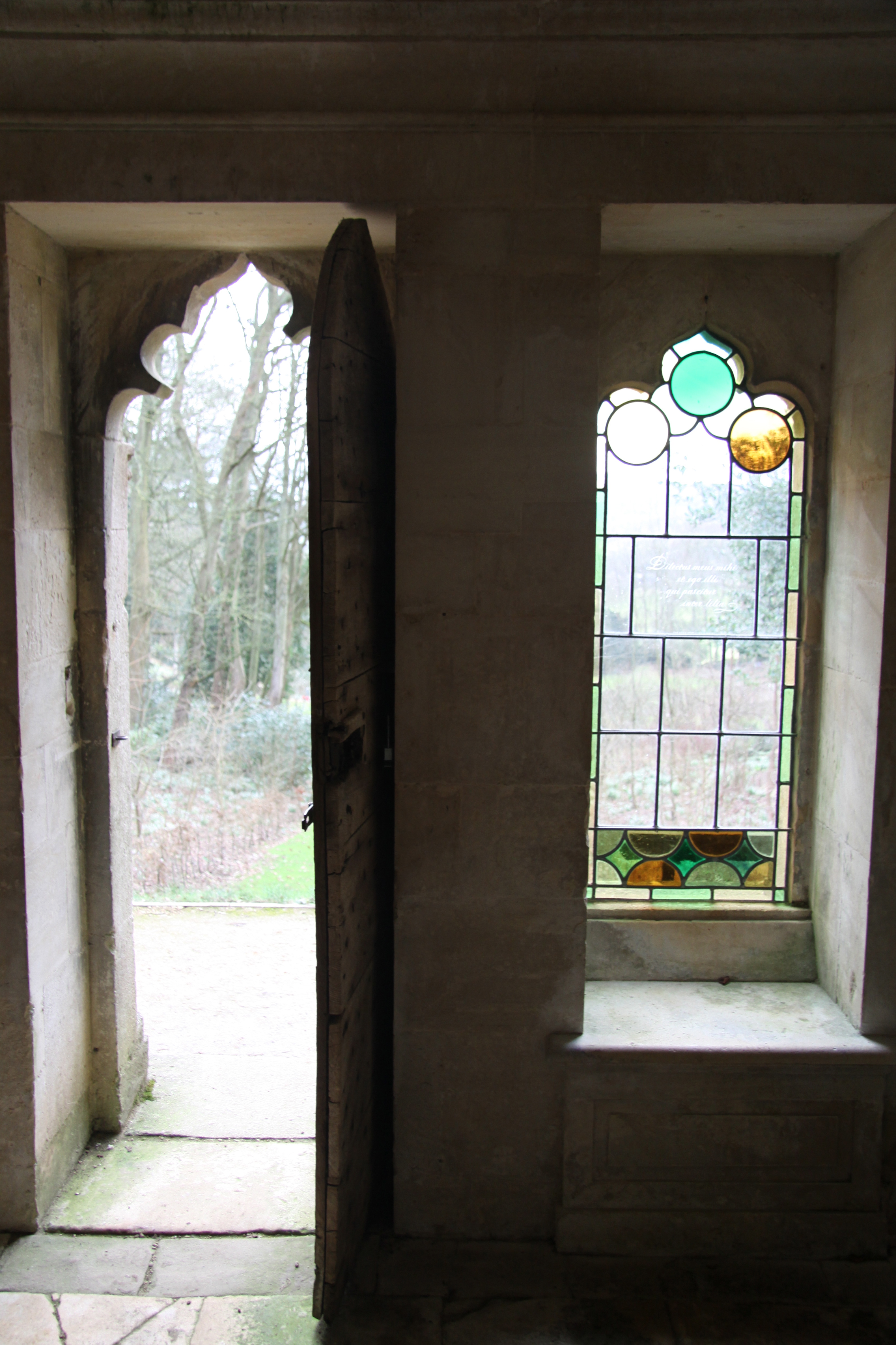 And the simple ashlar stone interior with its handsomely paved floor is brightly illuminated by intense pockets of stained glass; these in turn cast floaty pools of colour on the pale grey interior: