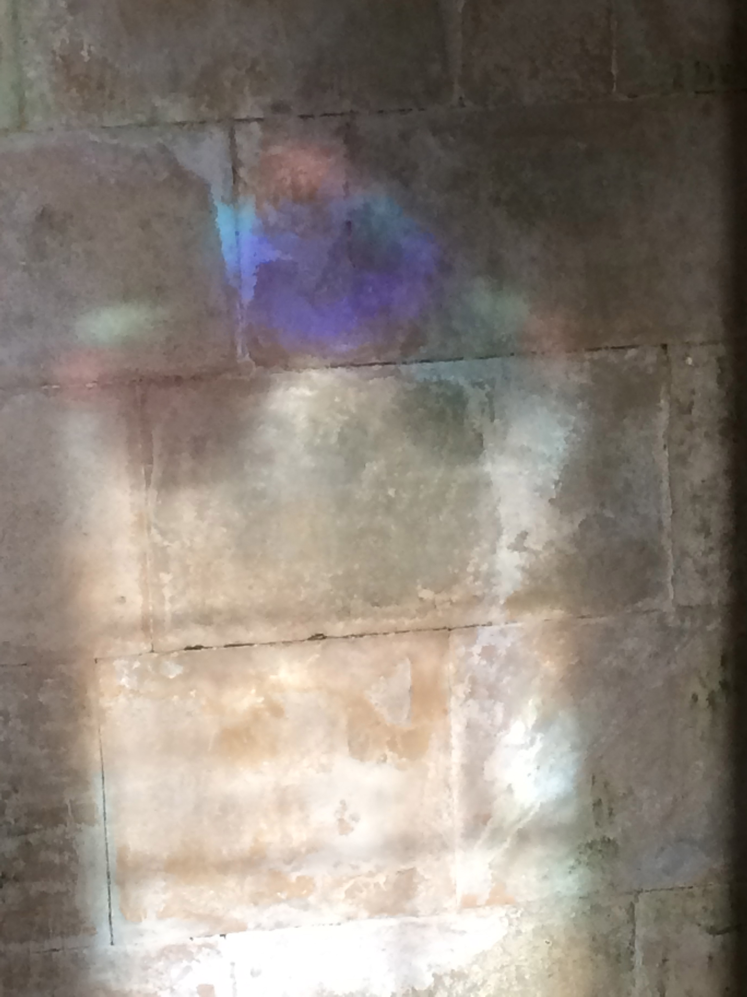 Reflection of coloured glass on stone, The Red House, Painswick