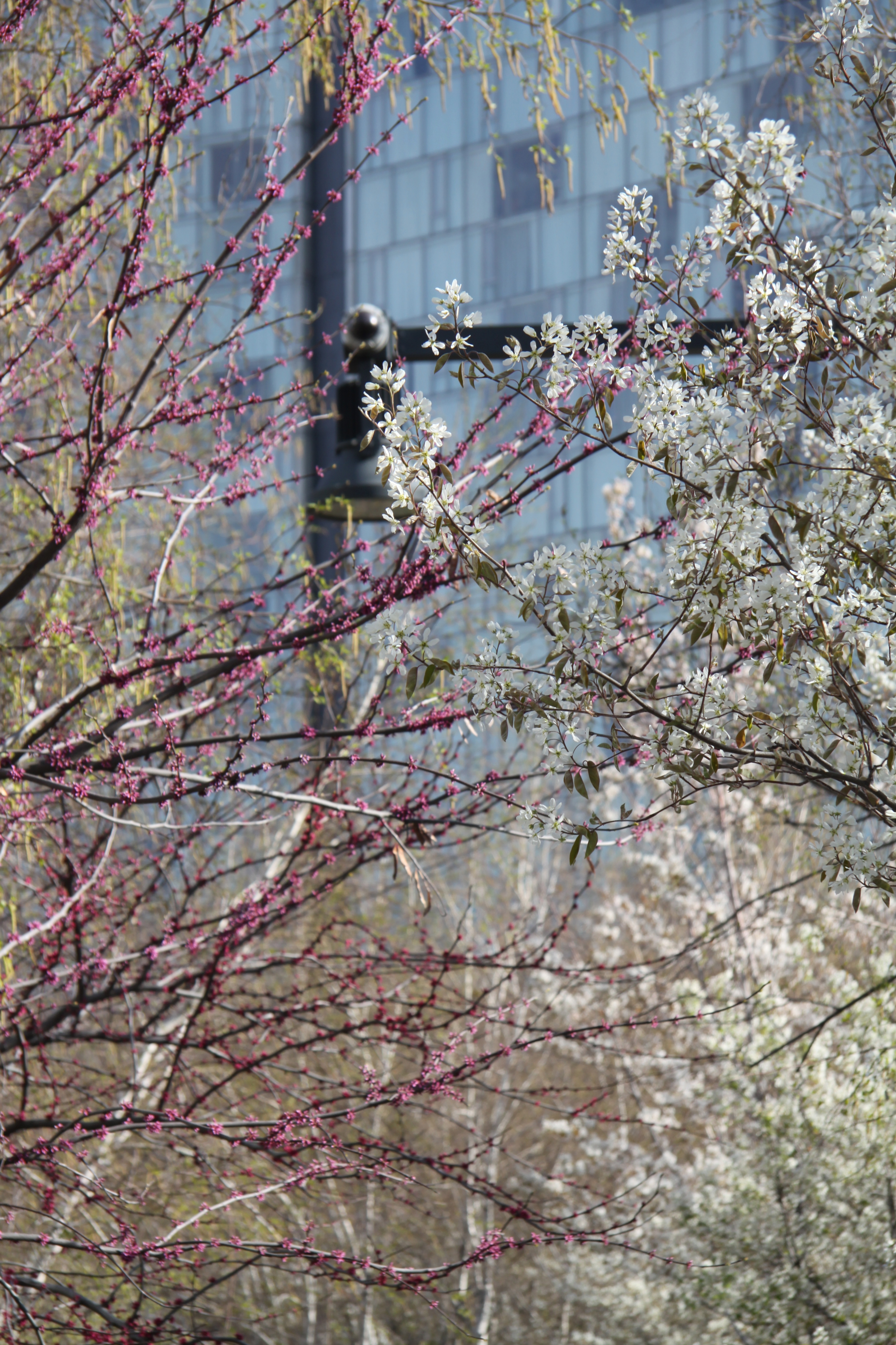 One minute you are catching a cheery rainbow-painted building through bud-laden branches: