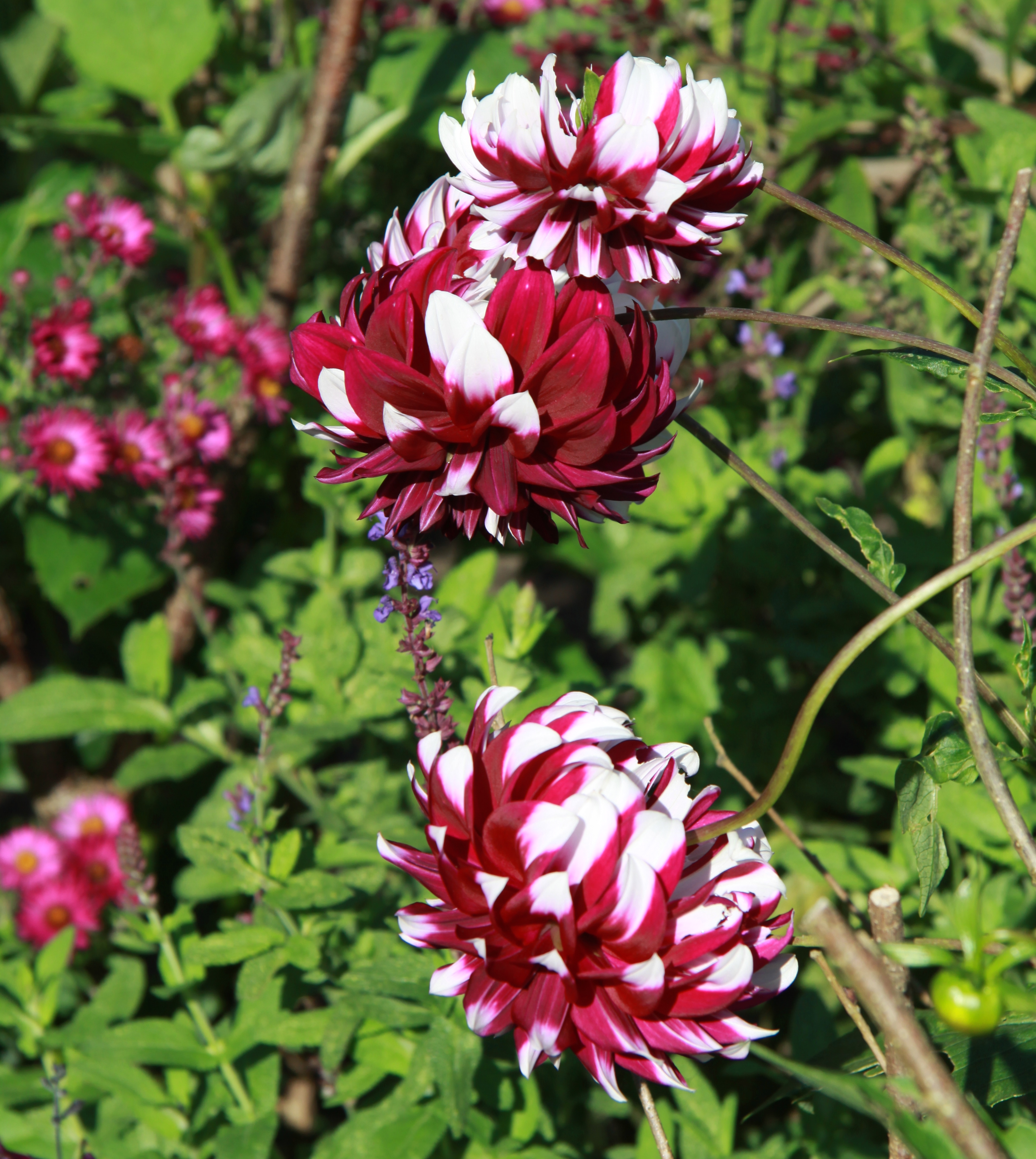 With the sun more helpfully behind me, I can revel in the towering shapes – I particularlyl ove this leggy annual, Leonotus ‘Staircase’ –  and bicolour dahlias: