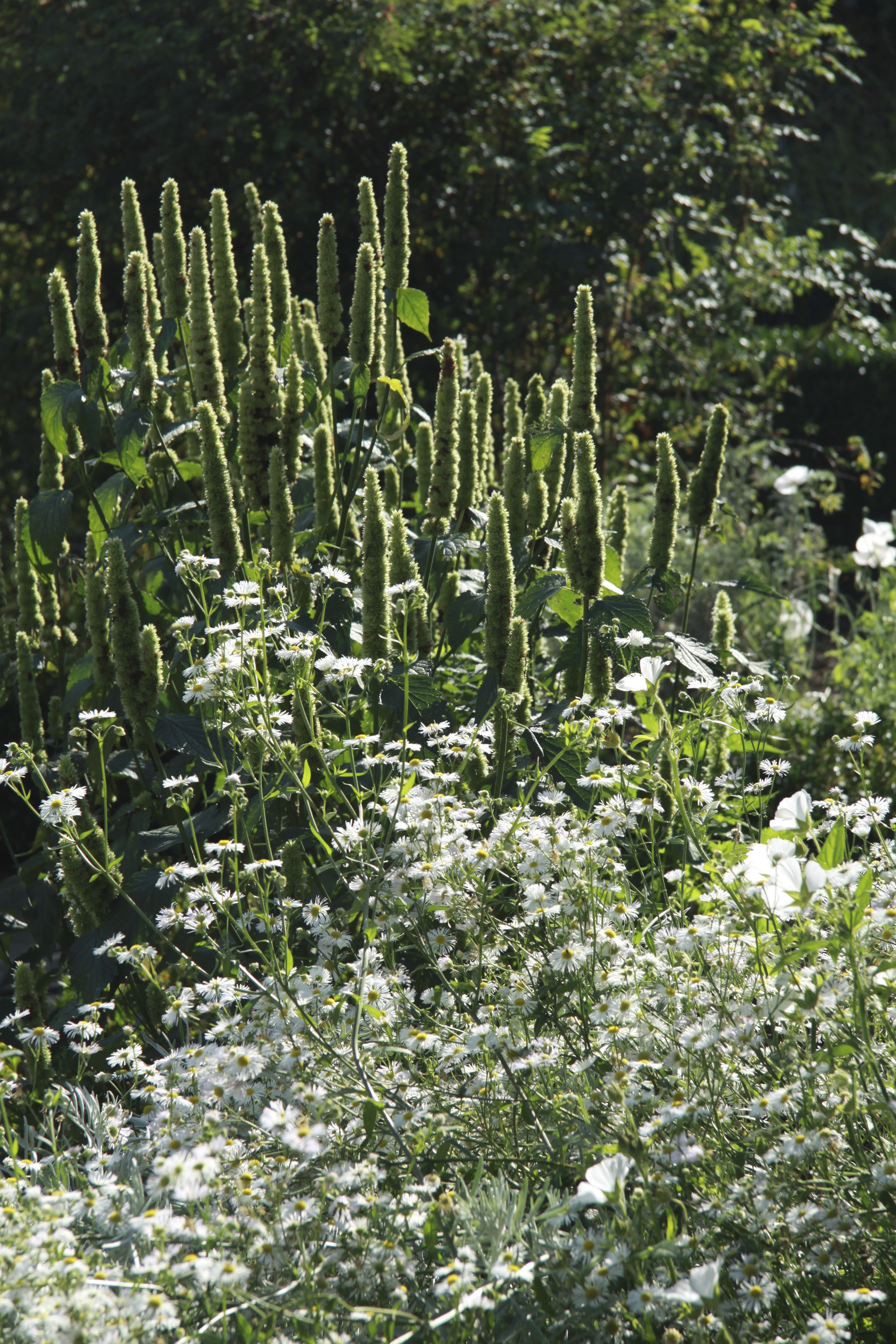 There is space in the White Garden for the sun to light up the bright green leaved Nicotiana sylvestris like a cool summer torch. The Solanum jasminoides ‘Alba’ is going nicely crazy over an arch, and the delicate daisy we met in a vase at the entrance to the garden (Boltonia asteroides) is contrasted by dynamic, velvety green flowerheads of Agastache rugosa ‘Alabaster’.