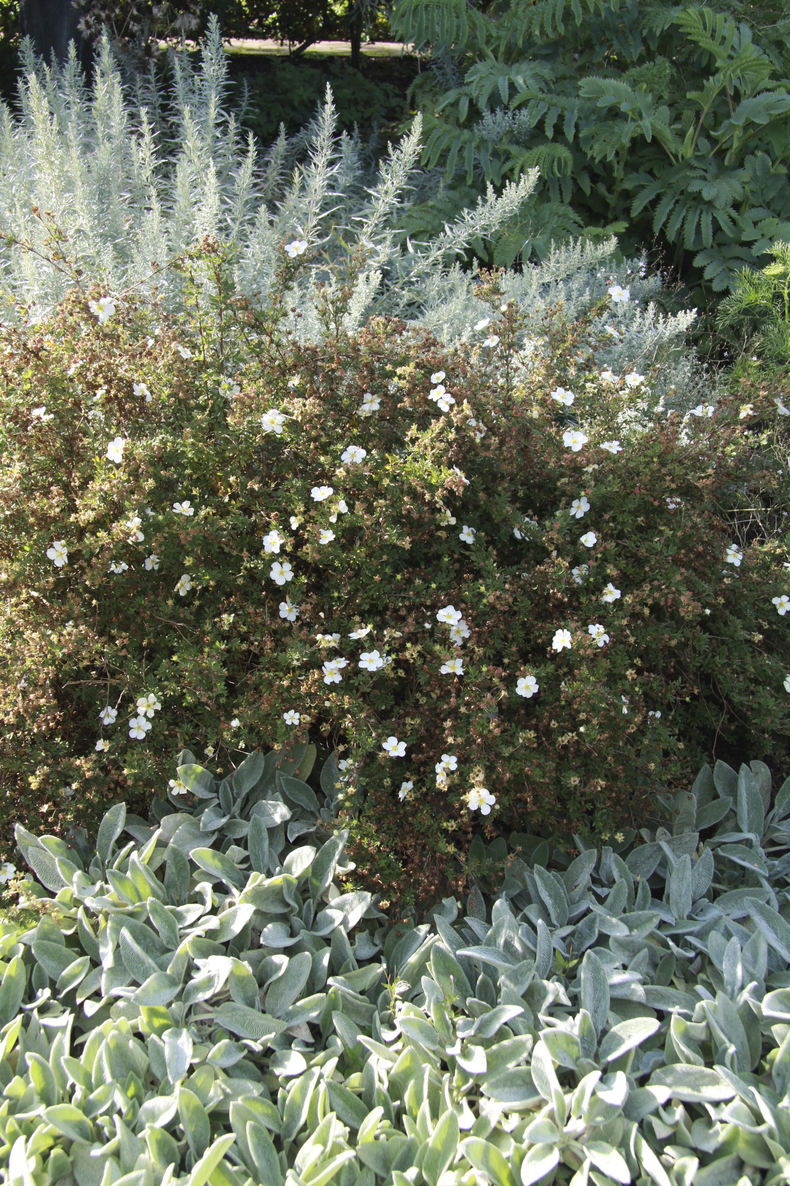 I like it best when there is a dense coming together of contrasting shades and textures – here the soft, velvety Stachys byzantina, the dainty wiriness of Potentilla fruticosa ‘Abbottswood’, the silvery grey of artemisia, and right at back the handsome architectural grey-green of Melianthus major:
