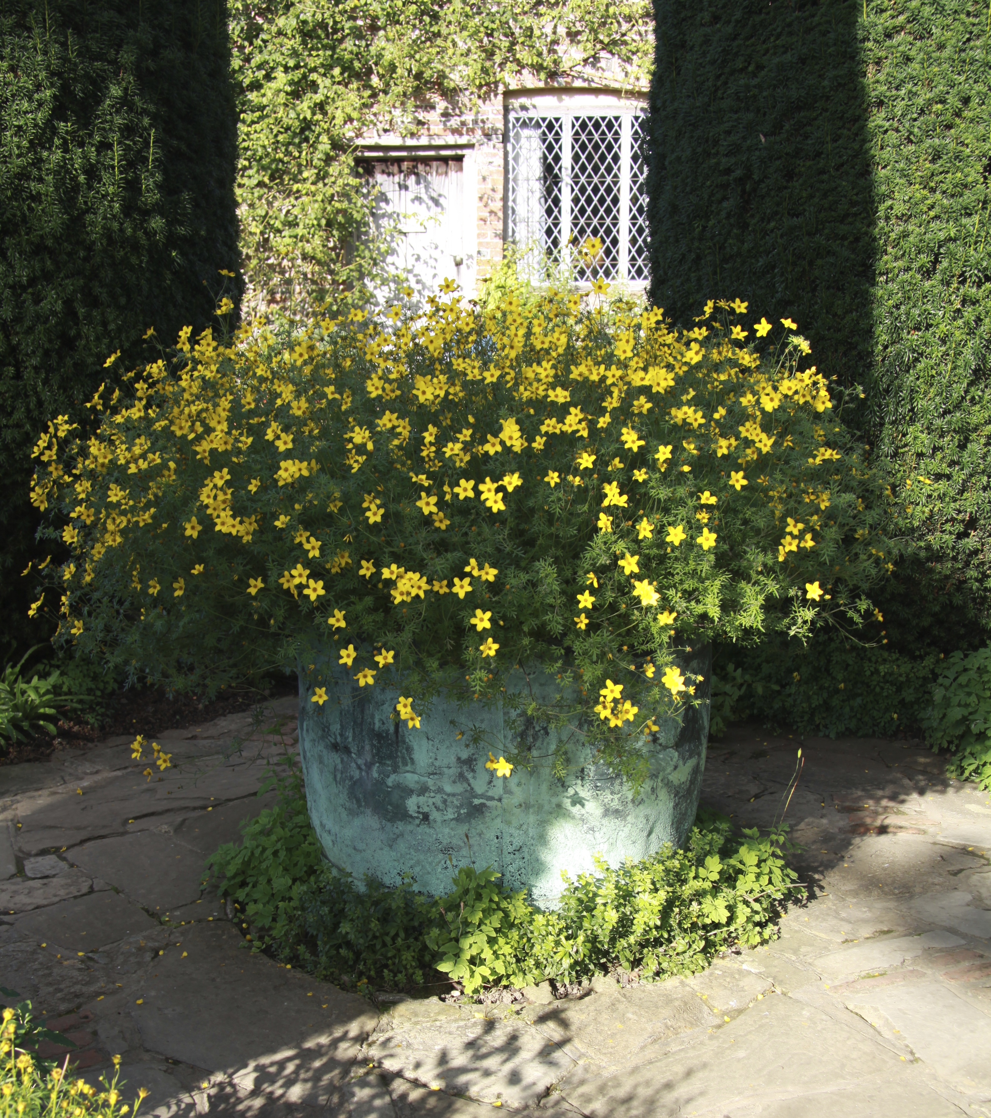 Bidens ferulafolia in a copper urn at the centre of four Irish Yews in the Cottage Garden