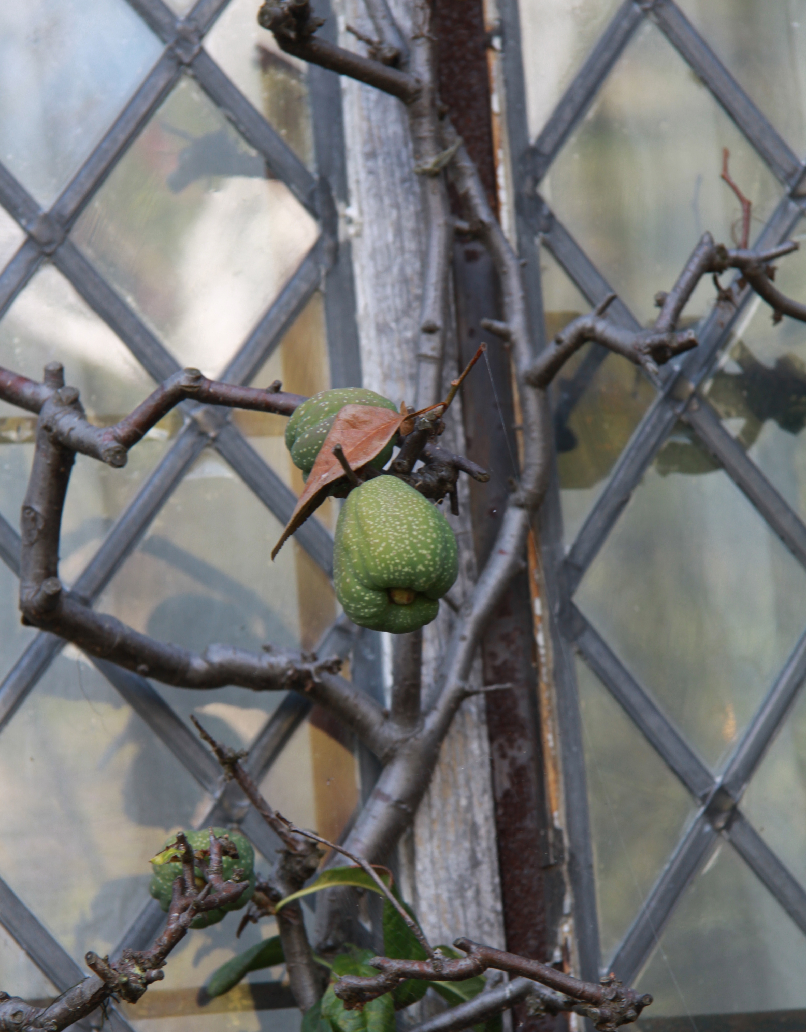 I feel encouraged now to look at everything closer up – the delicate creamy bells and twining foliage of Clematis rehderiana – in such perfect scale with the diamond leaded glass window panes – and the solid, speckled antique-looking fruits of ornamental quince (Chaenomeles speciosa) and, further on, fat timeless rose hips against brick: